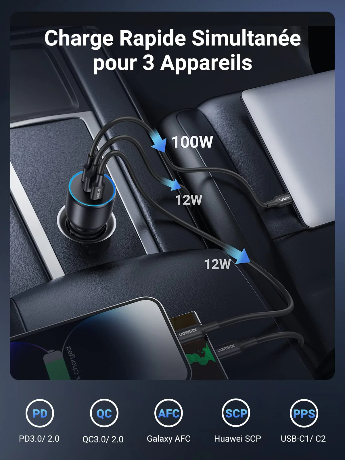 UGREEN 130W Chargeur Voiture USB C PD QC 3.0
