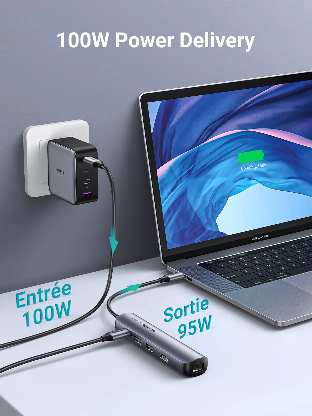 - Le port USB C Power Delivery qui vous permet d'alimenter rapidement votre ordinateur jusqu'à 95W (le hub consomme 5W de puissance).